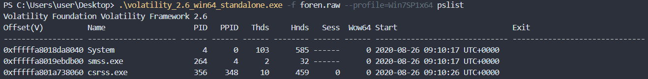 .\volatility_2.6_win64_standalone.exe -f foren.raw --profile=Win7SP1x64 pslist