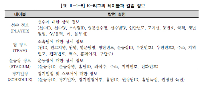- K-리그와는 별개로 회사의 부서와 사원 테이블의 칼럼들도 정리한다.