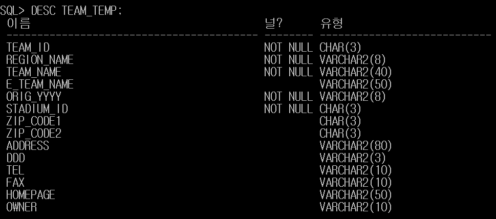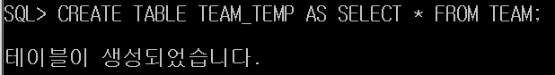 [예제] 선수(PLAYER) 테이블과 같은 내용으로 TEAM_TEMP라는 복사 테이블을 만들어 본다.