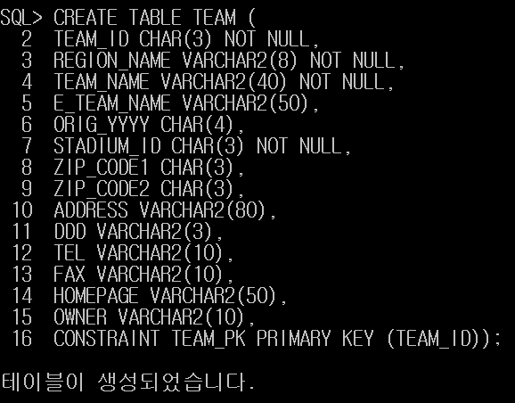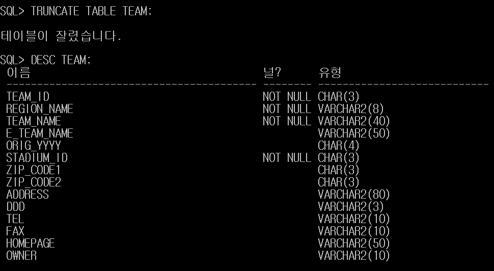 제약조건 : 기본 키(PRIMARY KEY) → TEAM_ID (제약조건명은 TEAM_ID_PK), NOT NULL → REGION_NAME, TEAM_NAME, STADIUM_ID (제약조건명은 미적용)