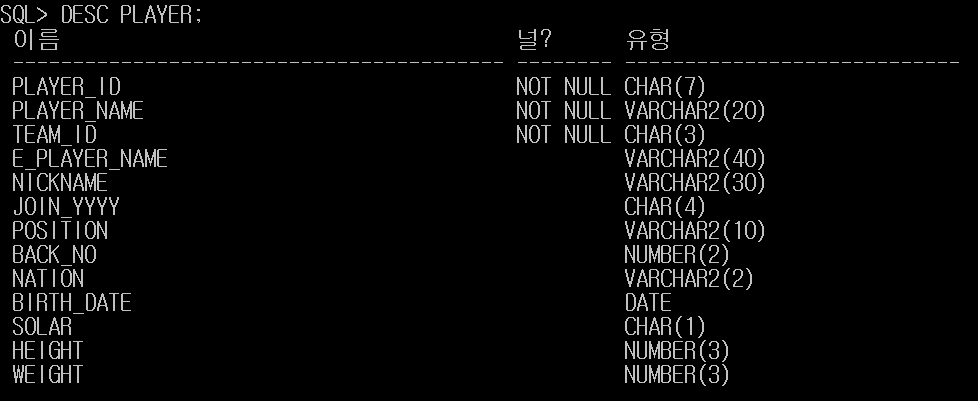[예제] 선수(PLAYER) 테이블의 구조를 확인한다.