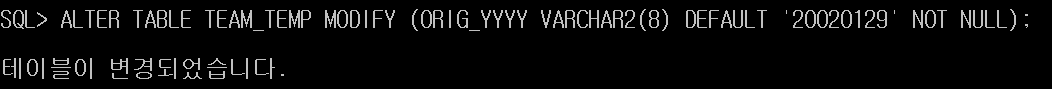 [예제] TEAM_TEMP 테이블의 ORIG_YYYY 칼럼의 데이터 유형을 CHAR(4)→VARCHAR2(8)으로 변경하고, 향후 입력되는 데이터의 DEFAULT 값으로 '20020129'을 적용하고, 모든 행의 ORIG_YYYY 칼럼에 NULL이 없으므로 제약조건을 NULL → NOT NULL로 변경한다.