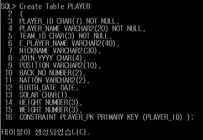 *칼럼 옆에 'primary key'라고 입력해도 된다. ex) PLAYER_ID CHAR(7) NOT NULL primary key 하지만 이번 예제에서는 제약조건에서 PK를 설정하라고 했고 별칭도 붙여주었기 때문에 contraint를 사용했다.