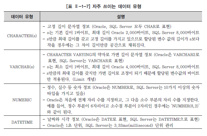 영문 이름이 VARCHAR(40)으로 40바이트가 지정되더라도 실제 ‘PARK,JISUNG’으로 데이터가 입력되는 경우 11바이트의 공간만을 차지한다. 주민등록번호, 사번처럼 고정된 길이의 문자열(길이를 얼마나 사용할지 예측할 수 없는 경우)을 가지지 않는다면 데이터 유형은 VARCHAR 유형을 적용하는 것이 바람직하다. CHAR가 아닌 VARCHAR, NUMERIC 유형에서 정의한 길이나 자릿수의 의미는 해당 데이터 유형이 가질 수 있는 최대한의 한계값을 정의한 것으로 볼 수 있다.