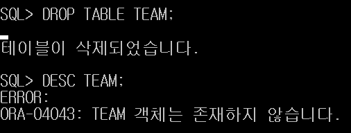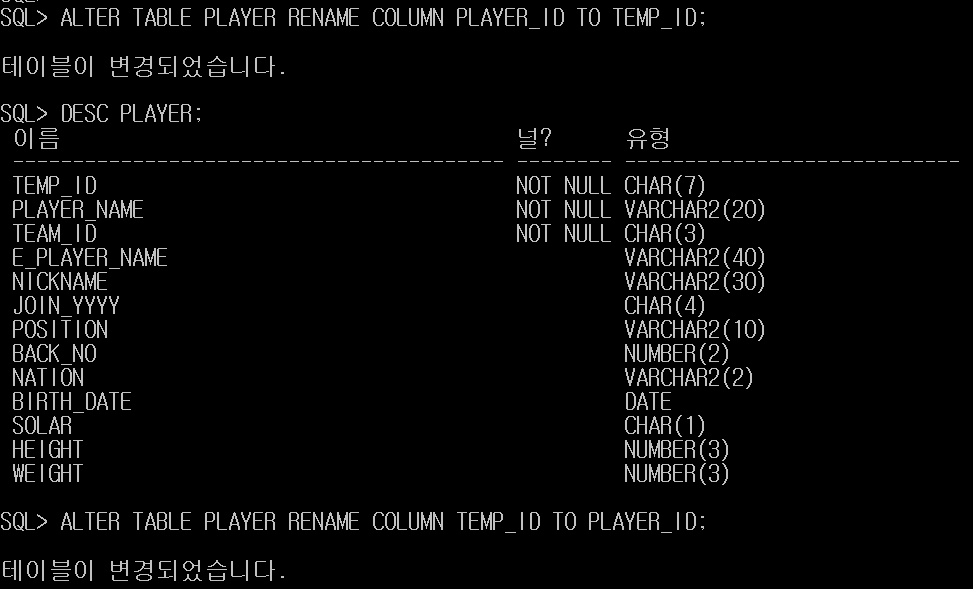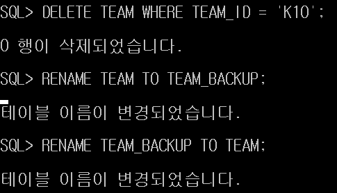 [예제] RENAME 문장을 이용하여 TEAM 테이블명을 다른 이름으로 변경하고, 다시 TEAM 테이블로 변경한다.