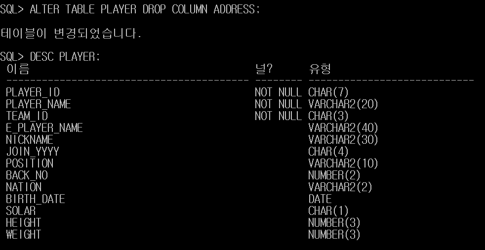 [예제] 앞에서 PLAYER 테이블에 새롭게 추가한 ADDRESS 칼럼을 삭제한다.