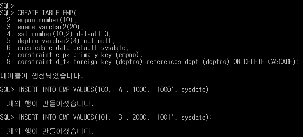 다음으로 EMP 테이블을 생성하고 데이터를 입력하는데 여기서 'On Delete Cascade' 옵션을 사용할 것이다.