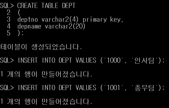 먼저 마스터 테이블인 DEPT를 생성하고 데이터를 입력한다.