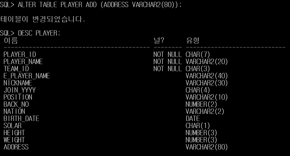 [예제] PLAYER 테이블에 ADDRESS(데이터 유형은 가변 문자로 자릿수 80자리로 설정한다.) 칼럼을 추가한다.