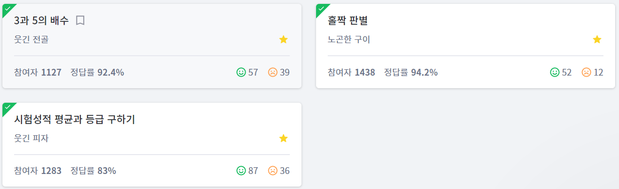 goorm 3과 5의 배수, 시험성적 평균과 등급 구하기, 홀짝 판별 #include #include using namespace std; string fun(int n) { if (n % 2 == 0) { return "even"; } else { return "odd"; } } int main(void) { int n; cin >> n; cout > n; int sum = 0; // 3과 5의 배수의 합 int ex = 0; // 15의 배수의 합 for(int i = 0; i > math >> eng; double avg = (kor + math + eng)/3.0; cout Algorithm/goorm 2020.08.12