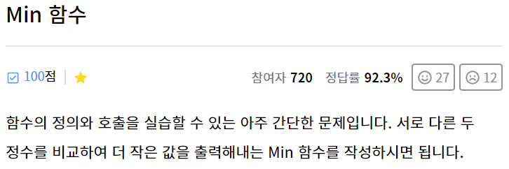 goorm Min 함수, 3의 배수 게임, 리그 횟수 경기 구하기 #include using namespace std; int Min(int a, int b){ if(a>b){ return b; } else{ return a; } } int main() { int n1, n2 = 0; cin >> n1 >> n2; cout > n; for(int i = 1; i Algorithm/goorm 2020.08.14