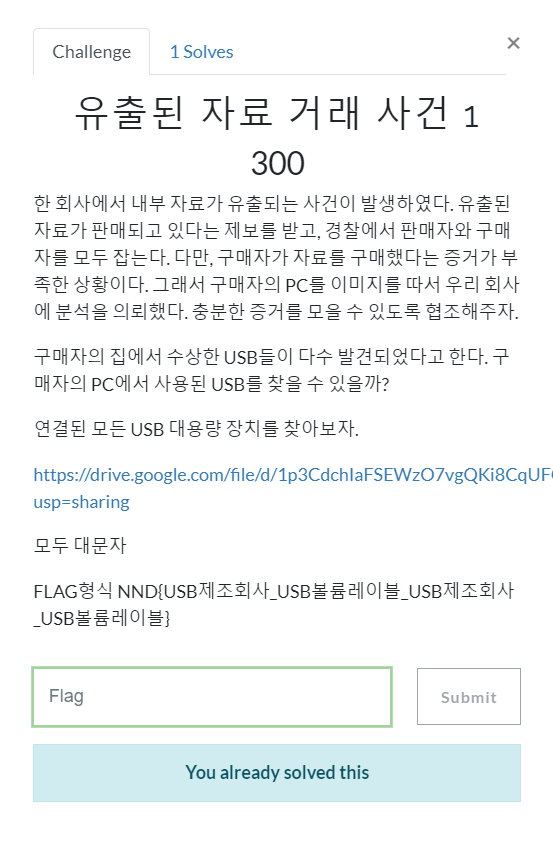 FTK로 열어 SOFTWARE를 내보내고 REGA로 열 생각이다. USB 연결 흔적이 저장되어 있는 레지스트리 경로 HKLM\SOFTWARE\Microsoft\Windows Portable Devices\Devices 를 들어가보면, 2개의 키가 존재한다. 플래그 형식에도 2개의 USB가 쓰인 것 같으니 맞는 것 같다. 키 경로 이름 자체에 모든 정보가 포함되어 있다. HKEY_LOCAL_MACHINE\SOFTWARE\Microsoft\Windows Portable Devices\Devices\WPDBUSENUMROOT#UMB#2&37C186B&0&STORAGE#VOLUME#_??_USBSTOR#DISK&VEN_SANDISK&PROD_ULTRA&REV_1.00#4C531001431019122384&0# ..